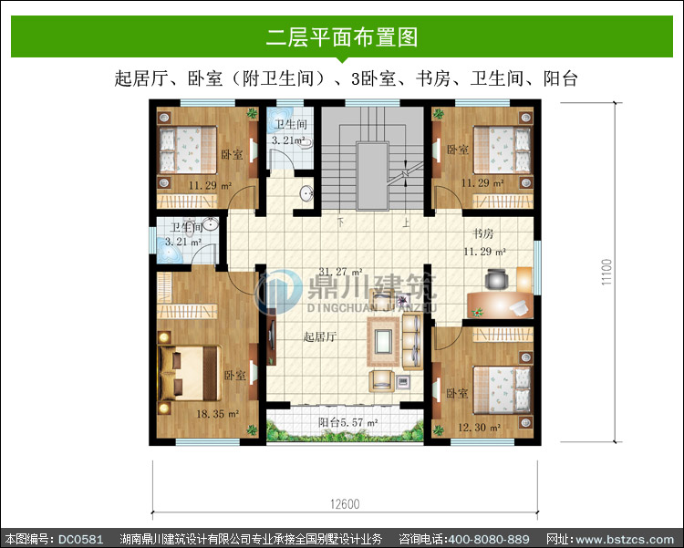 | 二 層: | 起居廳、臥室(附衛(wèi)生間)、3臥室、書房、衛(wèi)生間、陽臺 | |||