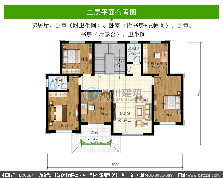 | 二 層: | 起居廳、臥室(附衛(wèi)生間)、臥室(附書房+衣帽間)、臥室、書房(附露臺)、衛(wèi)生間 | |||