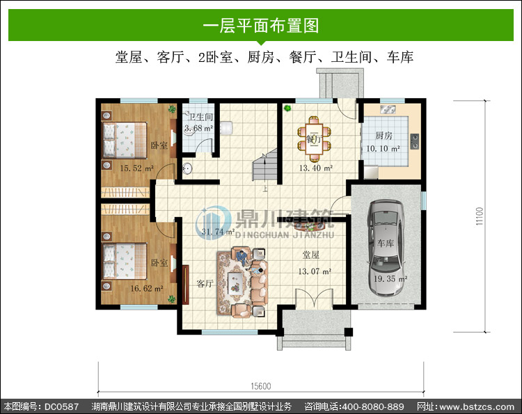 | 一 層: | 堂屋、客廳、2臥室、廚房、餐廳、衛(wèi)生間、車庫 | |||