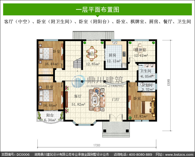 | 一 層: | 客廳(中空)、臥室(附衛生間)、臥室(附陽臺)、臥室、棋牌室、廚房、餐廳、衛生間 | |||