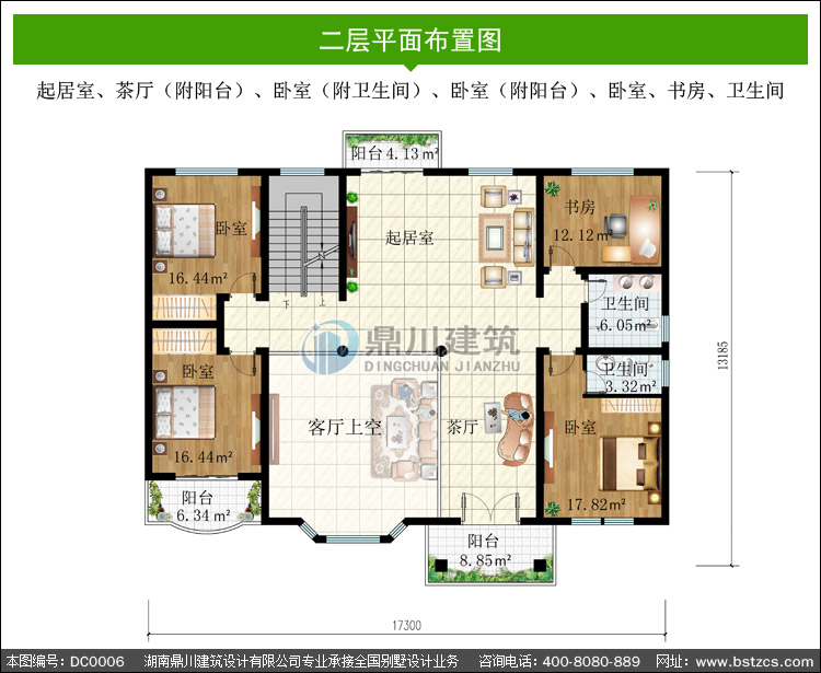 | 二 層: | 起居室、茶廳(附陽臺)、臥室(附衛生間)、臥室(附陽臺)、臥室、書房、衛生間 | |||