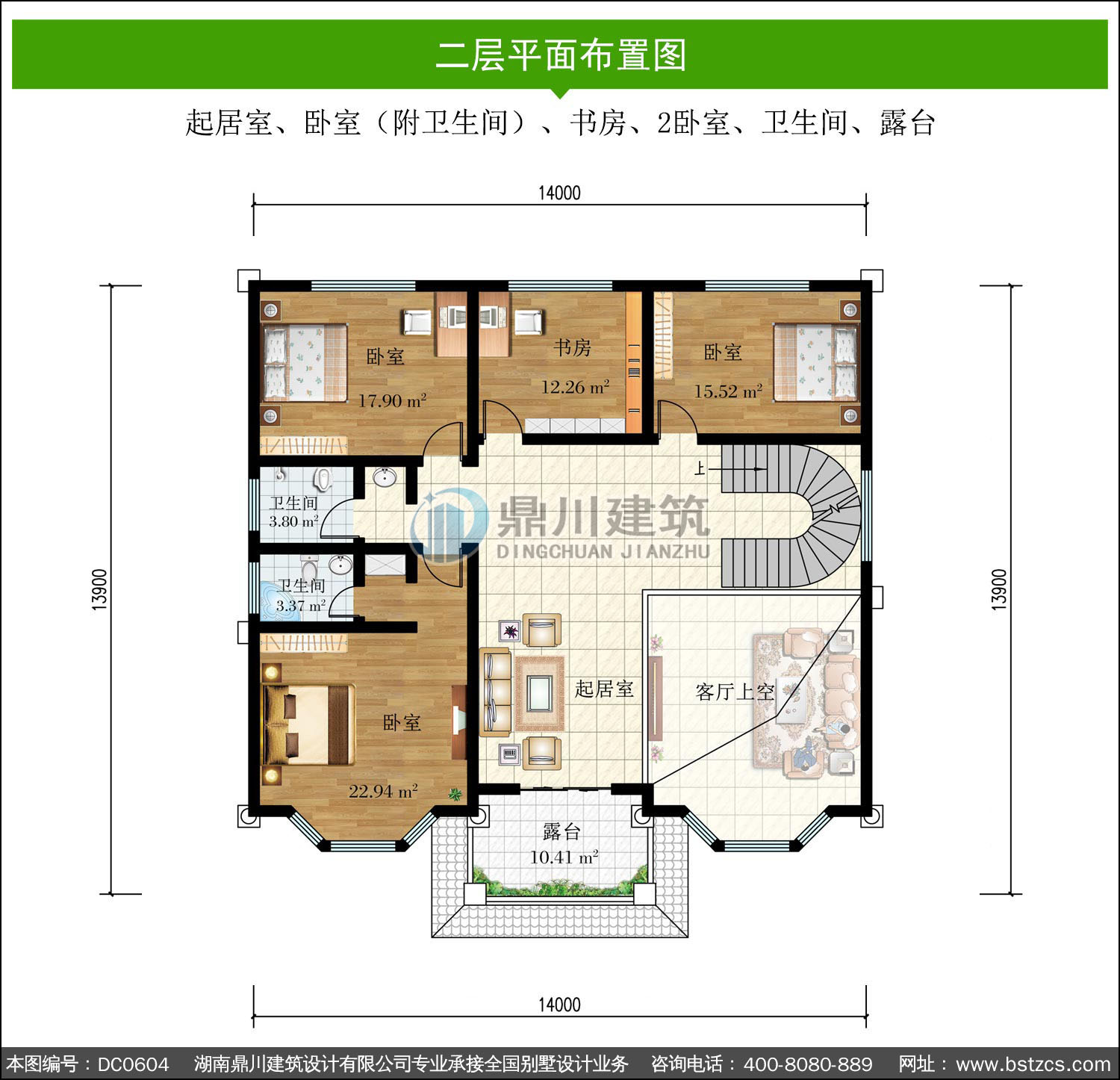 | 二 層: | 起居室、臥室(附衛生間)、書房、2臥室、衛生間、露臺 | |||