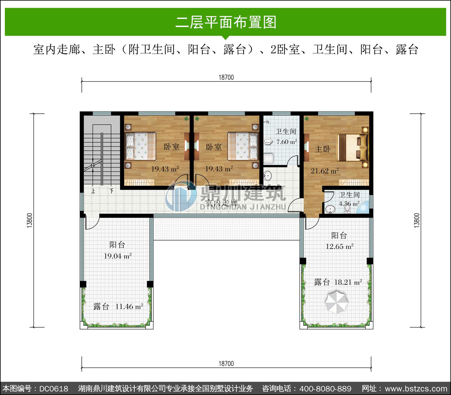 | 二 層: | 室內走廊、主臥(附衛生間、陽臺、露臺)、2臥室、衛生間、陽臺、露臺 | |||