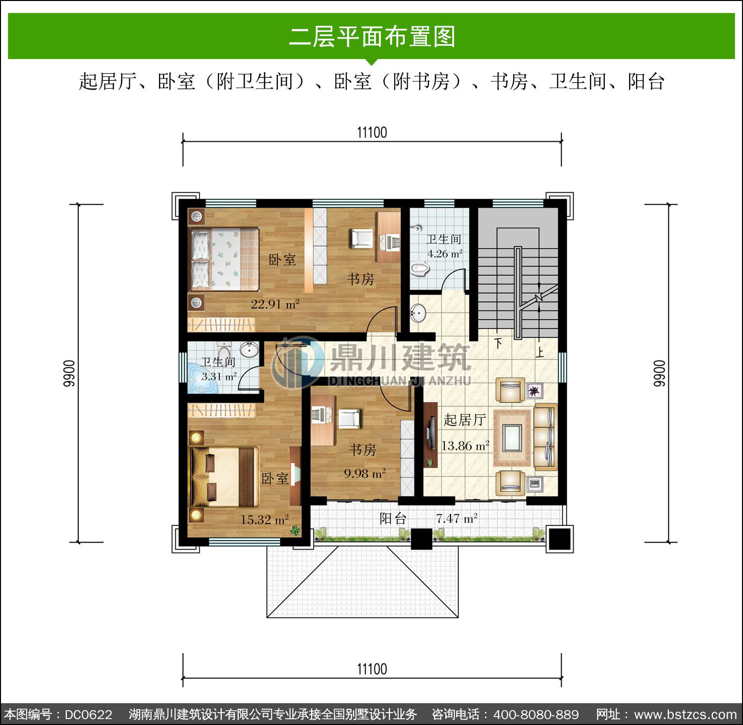 | 二 層: | 起居廳、臥室(附衛生間)、臥室(附書房)、書房、衛生間、陽臺 | |||