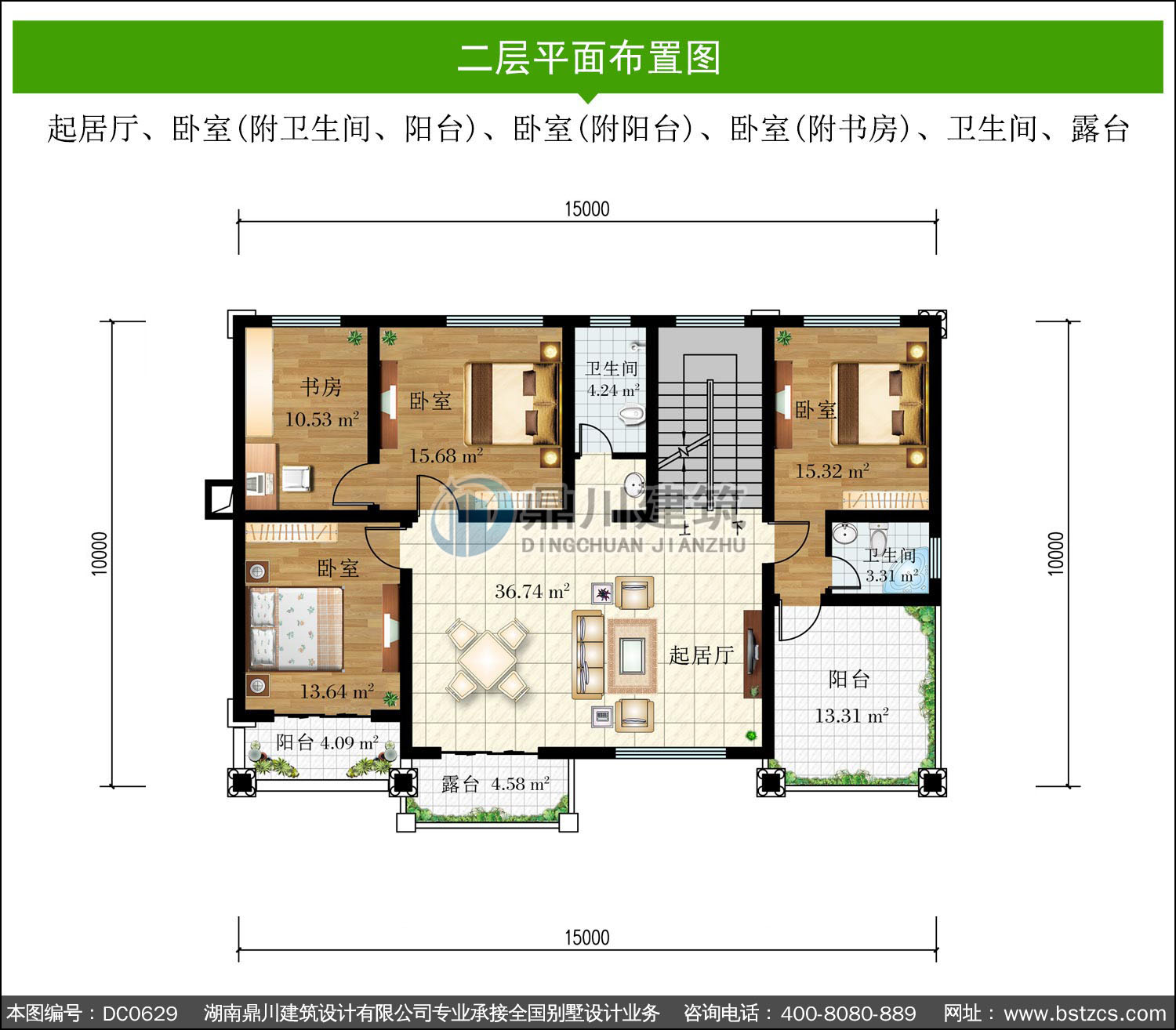 | 二 層: | 起居廳、臥室(附衛生間、陽臺)、臥室(附陽臺)、臥室(附書房)、衛生間、露臺 | |||