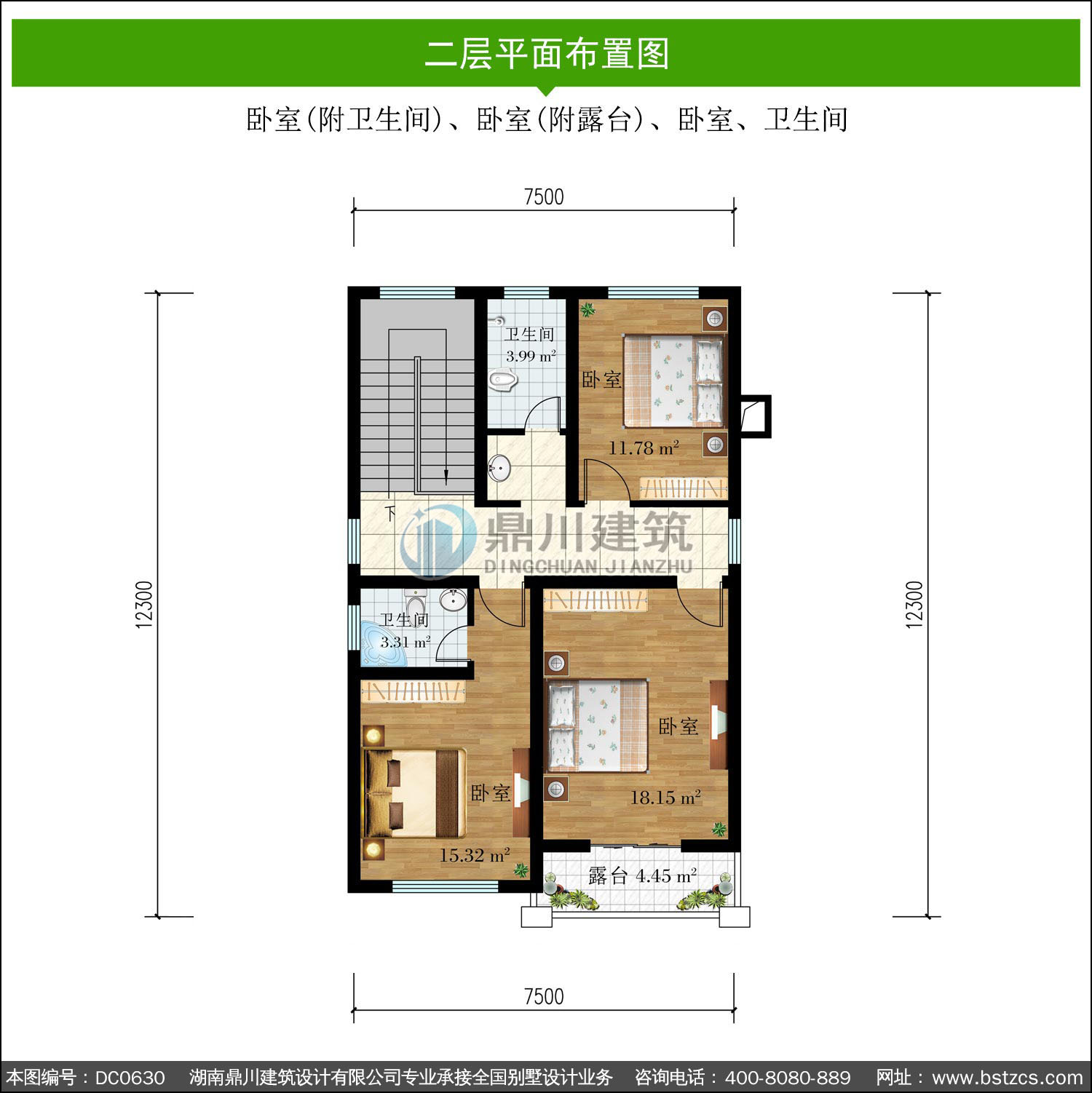 | 二 層: | 臥室(附衛生間)、臥室(附露臺)、臥室、衛生間 | |||