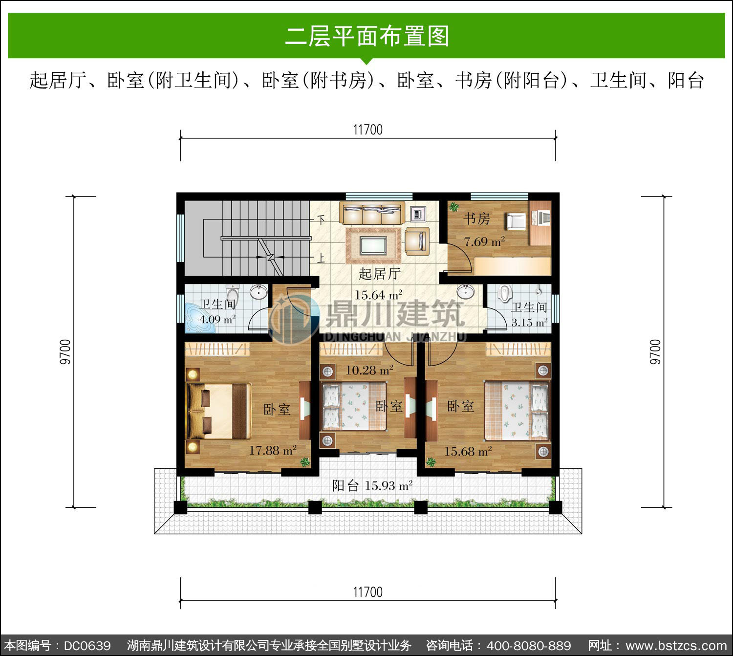 | 二 層: | 起居廳、臥室(附衛生間、陽臺)、2臥室(附陽臺)、書房、衛生間 | |||
