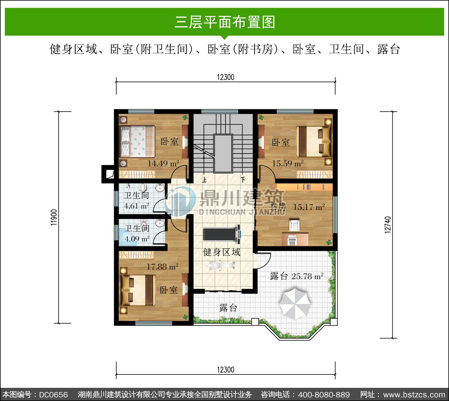 | 三 層: | 健身區域、臥室(附衛生間)、臥室(附書房)、臥室、衛生間、露臺 | |||