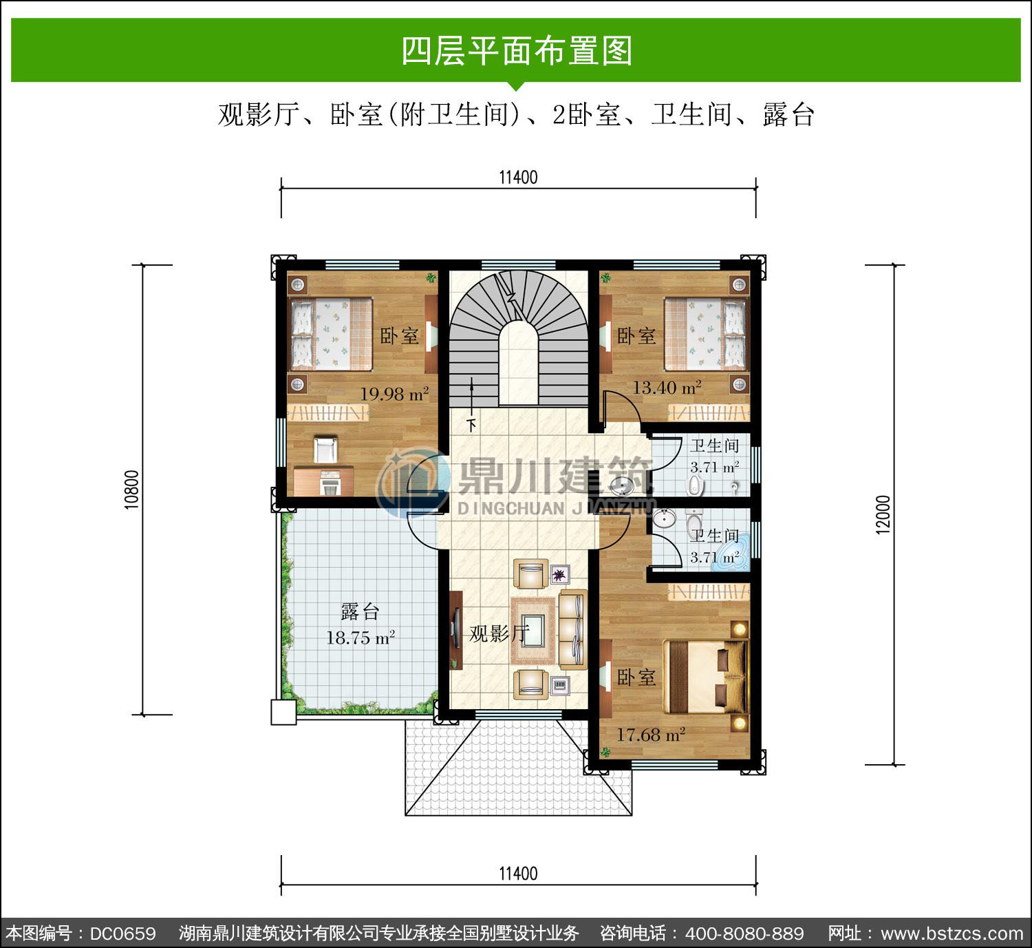 | 四 層: | 觀影廳、臥室(附衛生間)、2臥室、衛生間、露臺 | |||