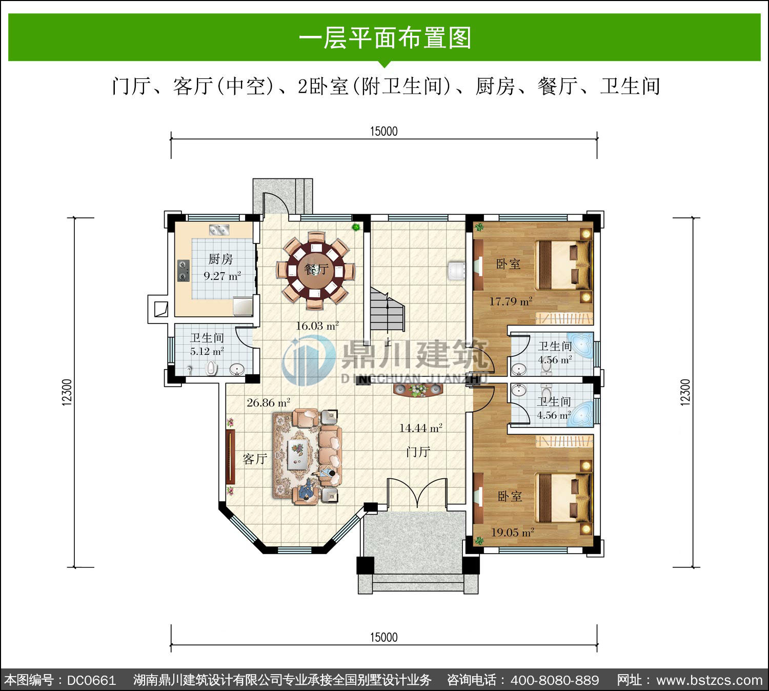 | 一 層: | 門廳、客廳(中空)、2臥室(附衛(wèi)生間)、廚房、餐廳、衛(wèi)生間 | |||