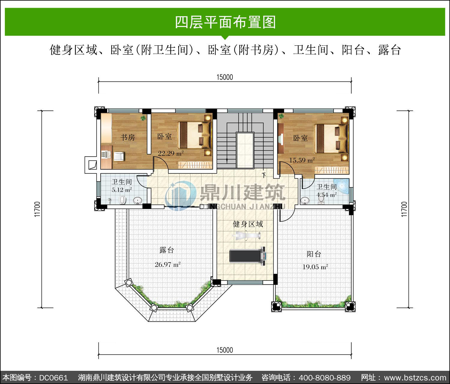 | 四 層: | 健身區(qū)域、臥室(附衛(wèi)生間)、臥室(附書房)、衛(wèi)生間、陽臺、露臺 | |||