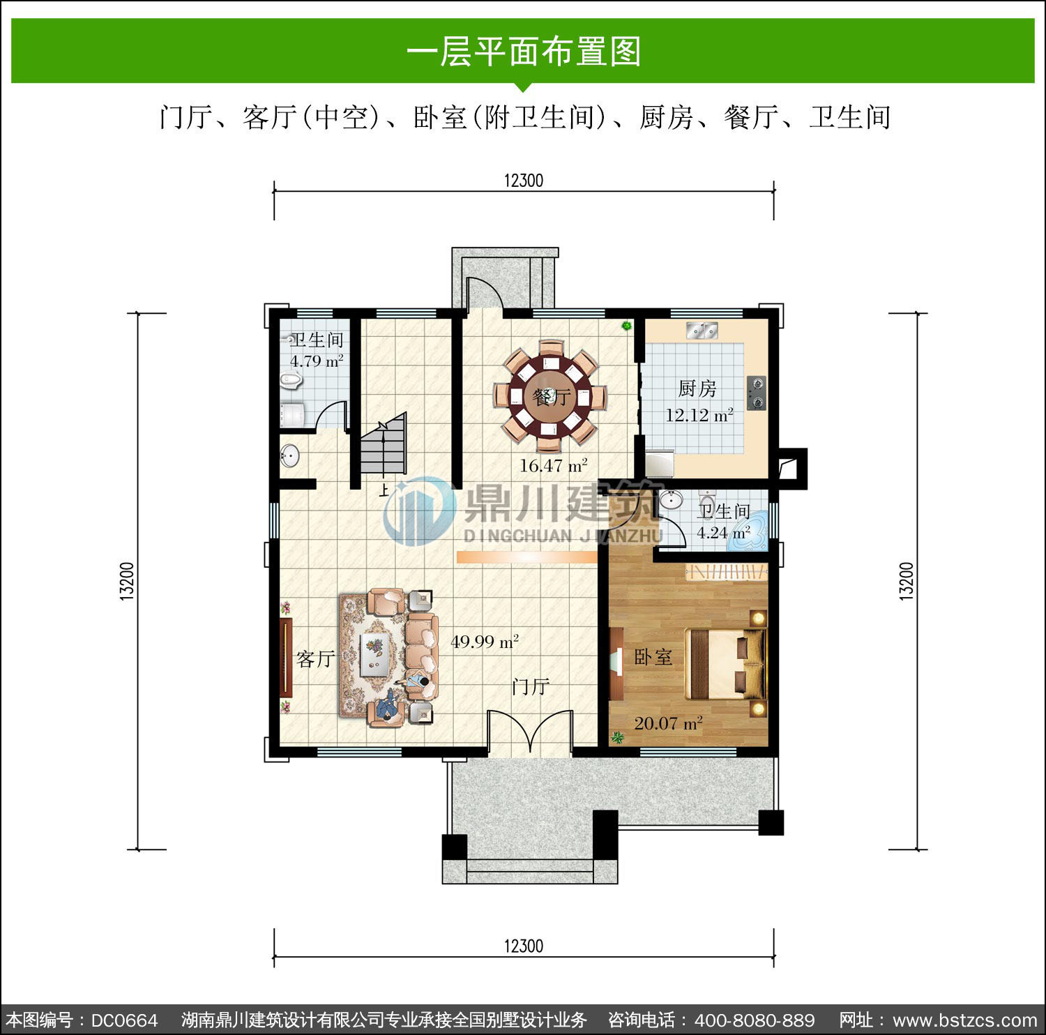 | 一 層: | 門廳、客廳(中空)、臥室(附衛生間)、廚房、餐廳、衛生間 | |||
