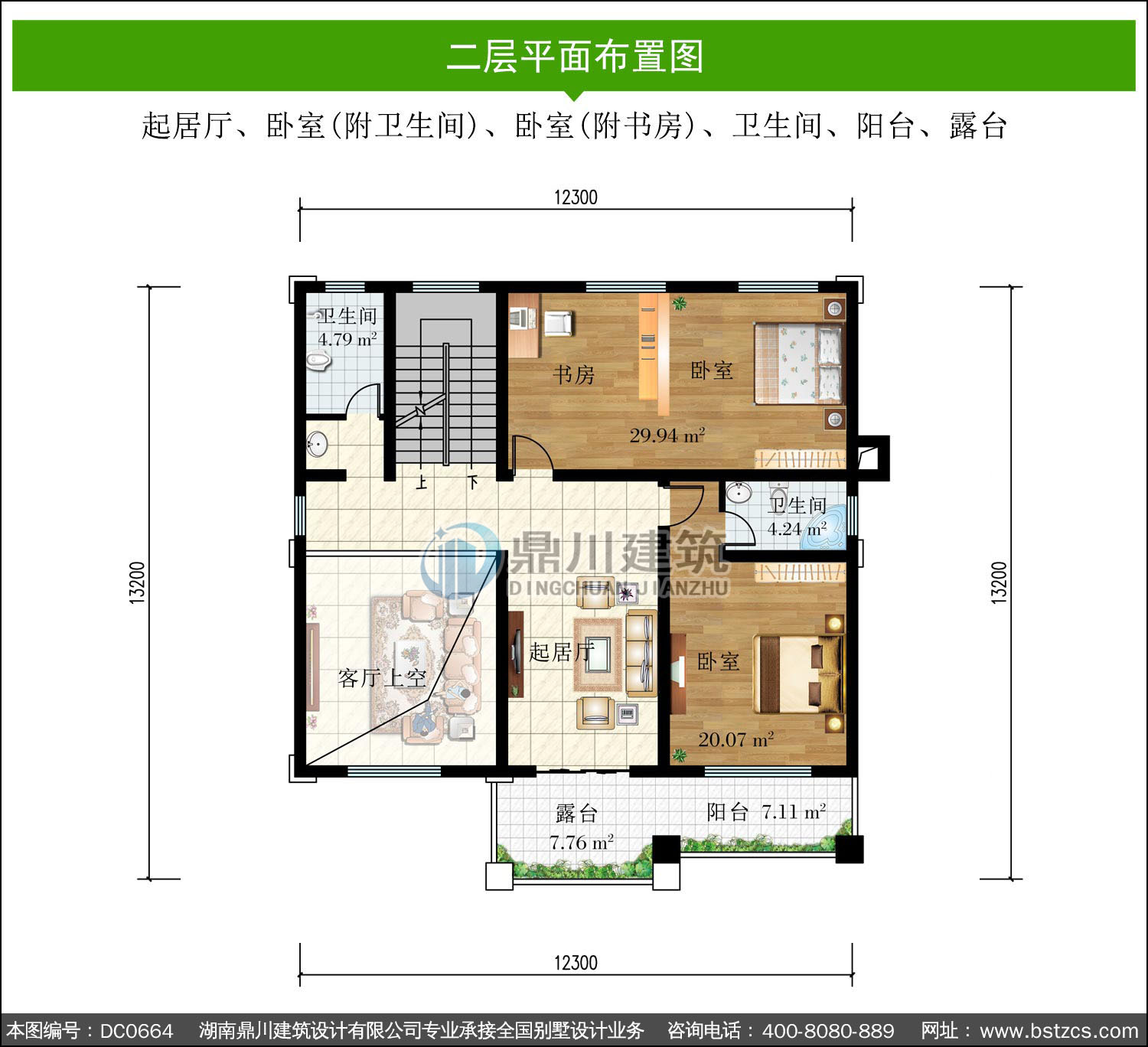 | 二 層: | 起居廳、臥室(附衛生間)、臥室(附書房)、衛生間、陽臺、露臺 | |||
