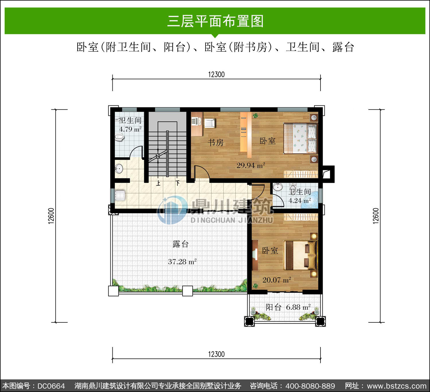 | 三 層: | 臥室(附衛生間、陽臺)、臥室(附書房)、衛生間、露臺 | |||