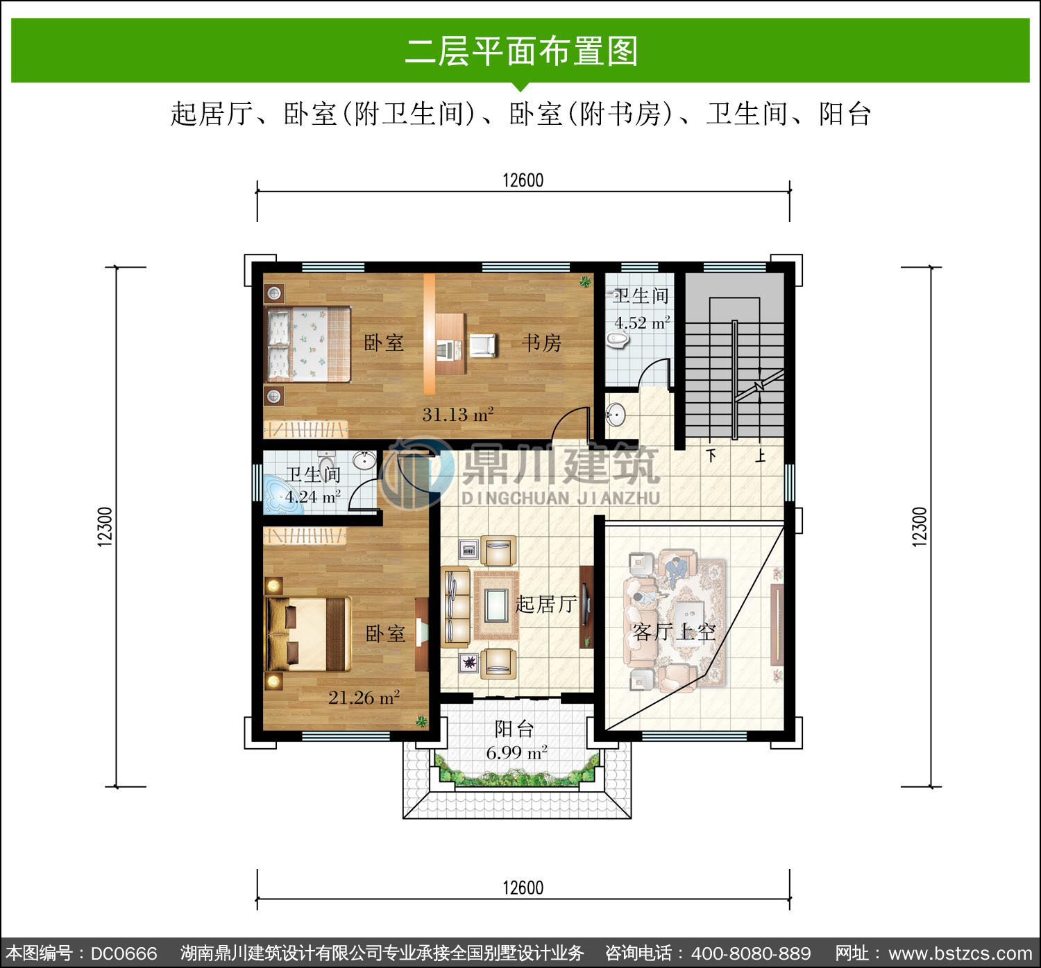 | 二 層: | 起居廳、臥室(附衛生間)、臥室(附書房)、衛生間、陽臺 | |||