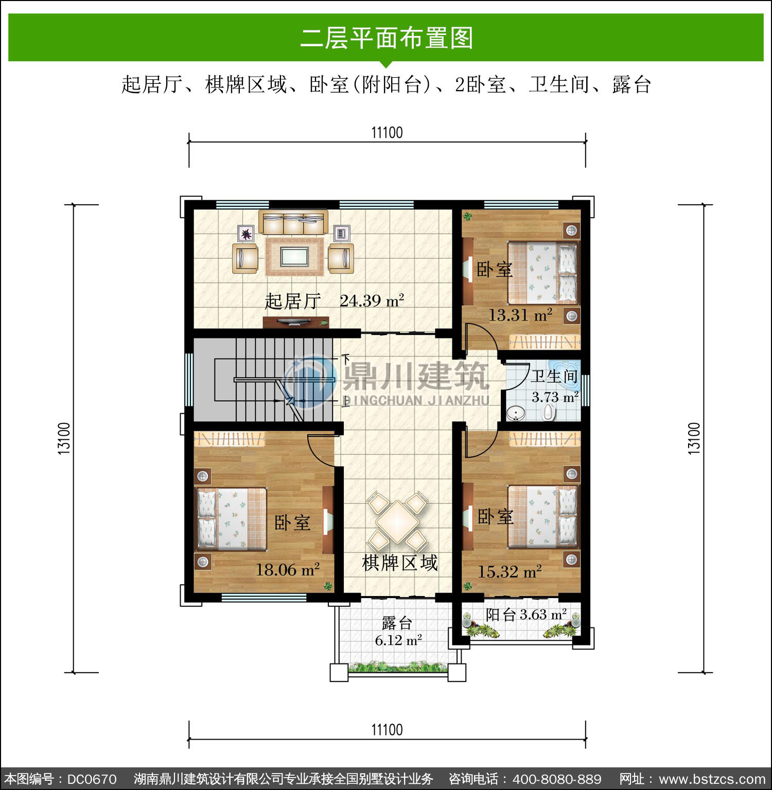 | 二 層: | 起居廳、棋牌區域、臥室(附陽臺)、2臥室、衛生間、露臺 | |||