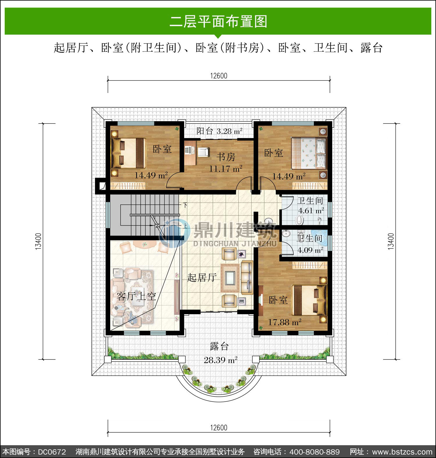 | 二 層: | 起居廳、臥室(附衛生間)、臥室(附書房)、臥室、衛生間、露臺 | |||