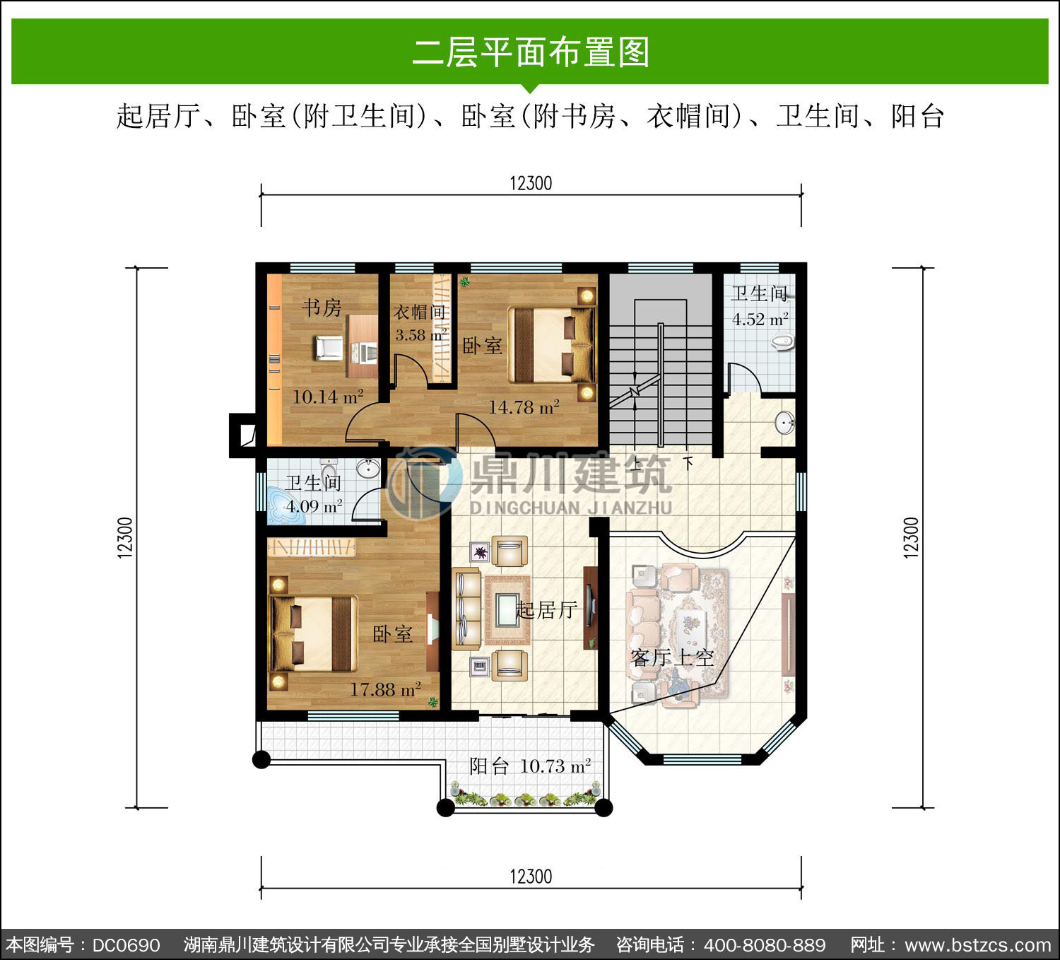 | 二 層: | 起居廳、臥室(附衛(wèi)生間)、臥室(附書房、衣帽間)、衛(wèi)生間、陽臺 | |||