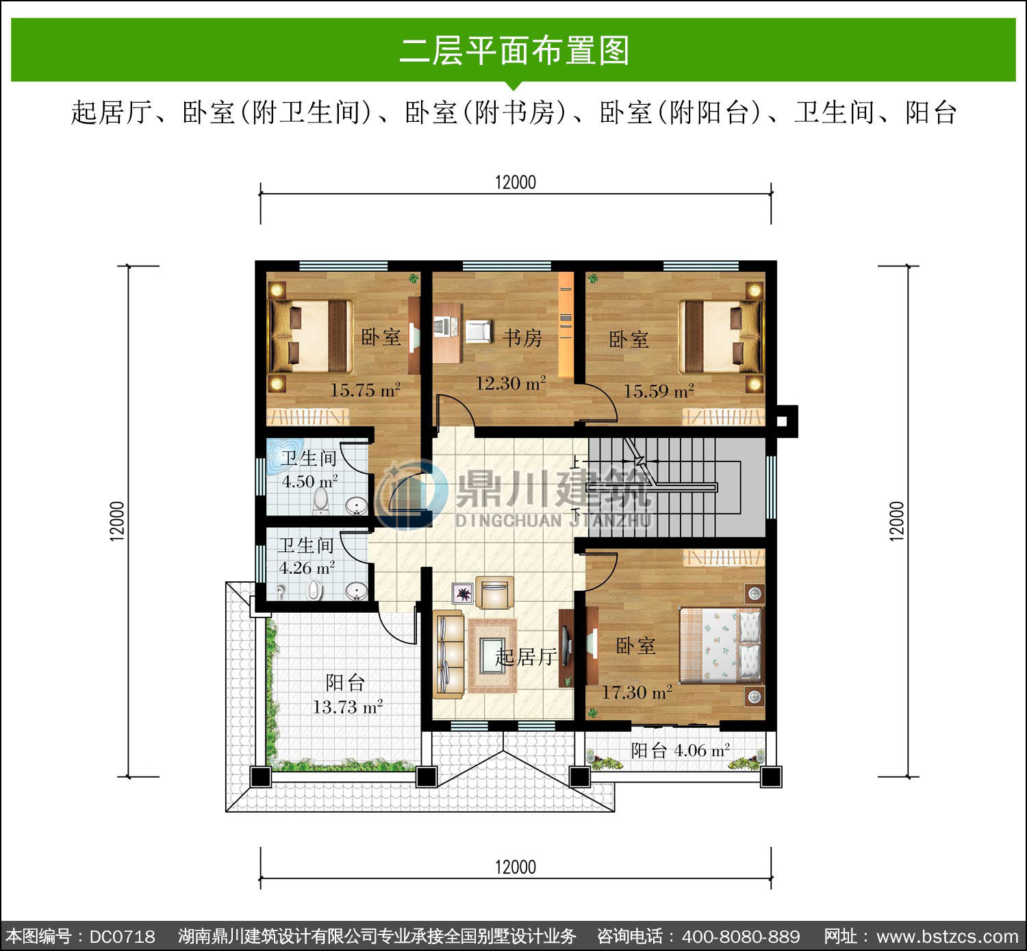 | 二 層: | 起居廳、臥室(附衛生間)、臥室(附書房)、臥室(附陽臺)、衛生間、陽臺 | |||