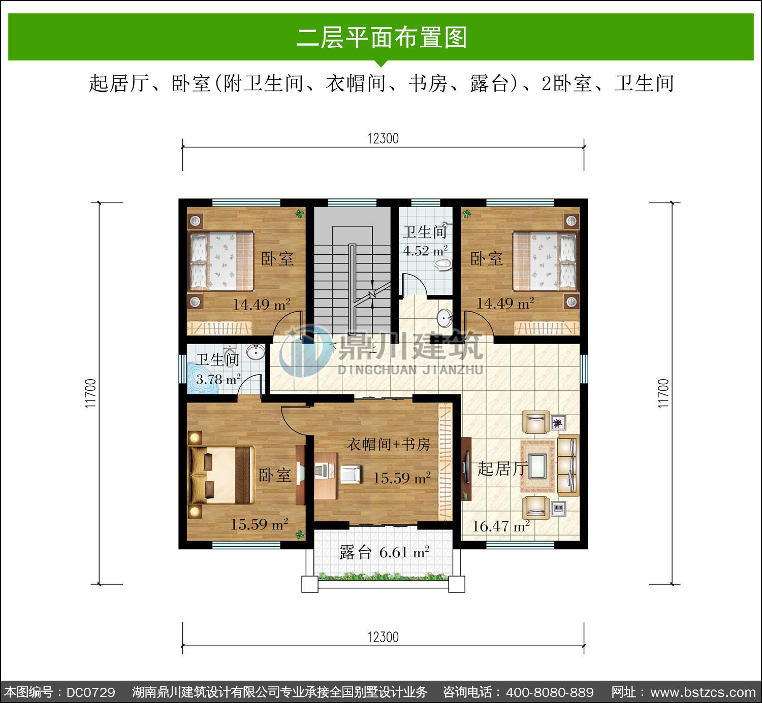 | 二 層: | 起居廳、臥室(附衛生間、衣帽間、書房、露臺)、2臥室、衛生間 | |||