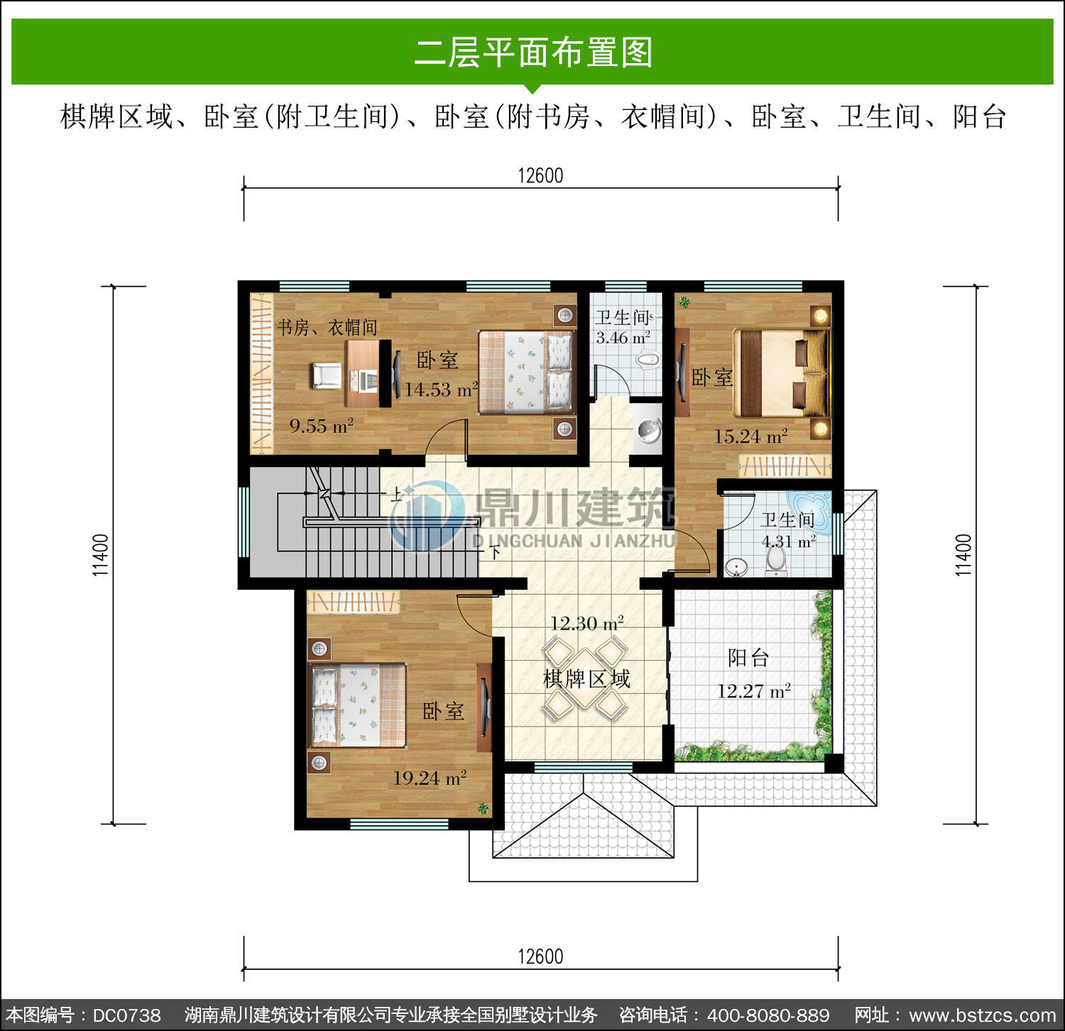 | 二 層: | 棋牌區域、臥室(附衛生間)、臥室(附書房、衣帽間)、臥室、衛生間、陽臺 | |||