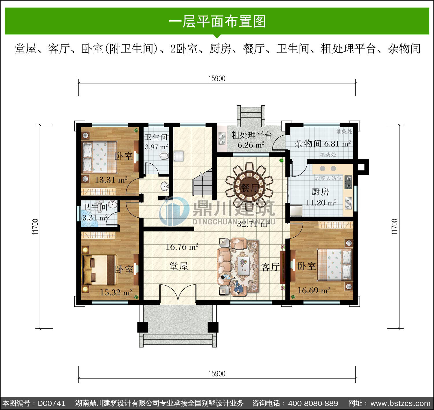 | 一 層: | 堂屋、客廳、臥室(附衛生間)、2臥室、廚房、餐廳、衛生間、粗處理平臺、雜物間 | |||