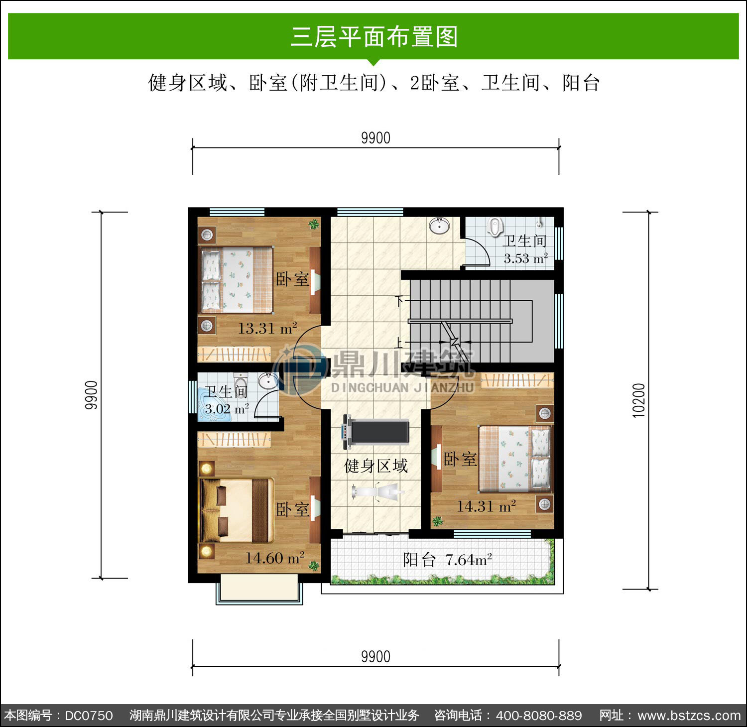 | 三 層: | 健身區域、臥室(附衛生間)、2臥室、衛生間、陽臺 | |||