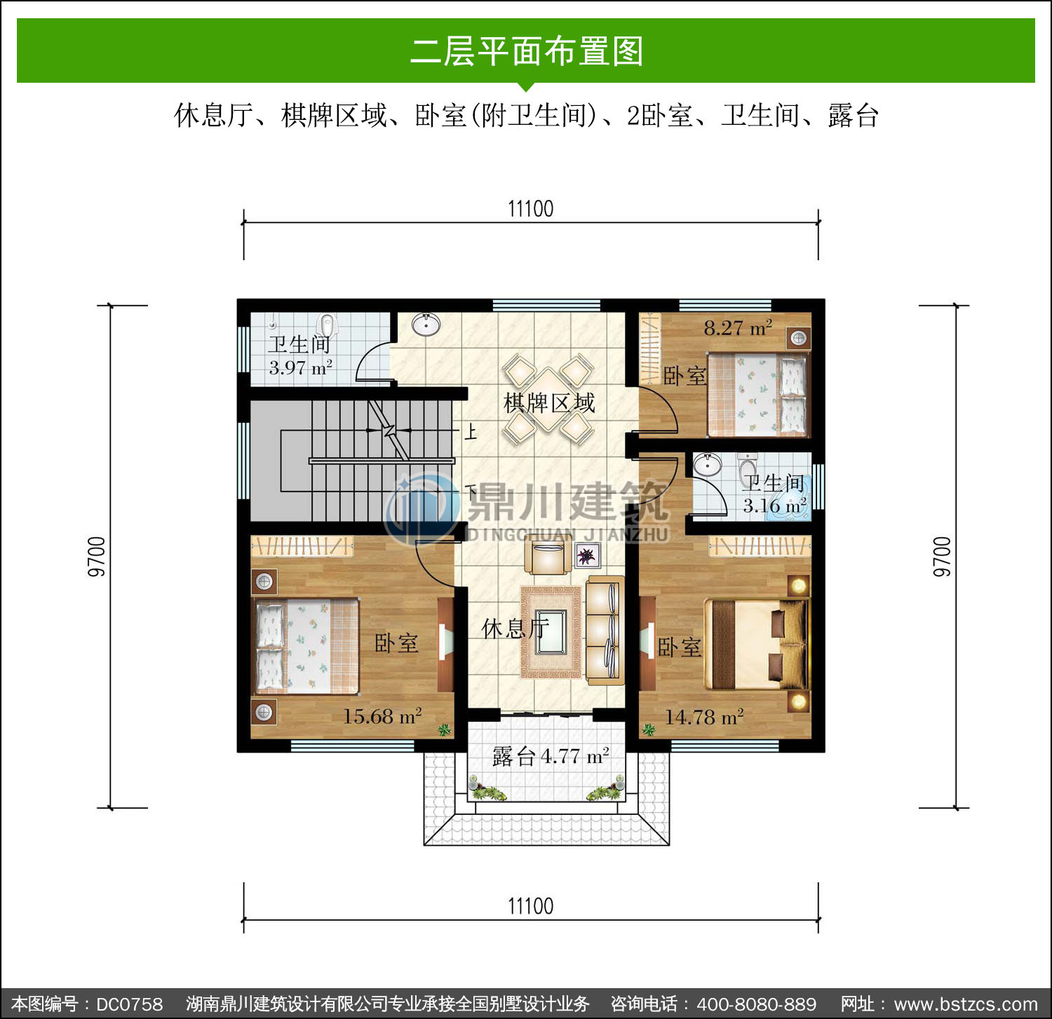 | 二 層: | 休息廳、棋牌區(qū)域、臥室(附衛(wèi)生間)、2臥室、衛(wèi)生間、露臺 | |||