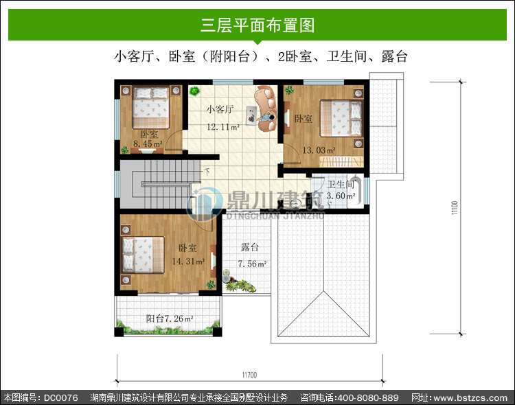 | 三 層: | 小客廳、臥室(附陽臺)、2臥室、衛生間、露臺 | |||