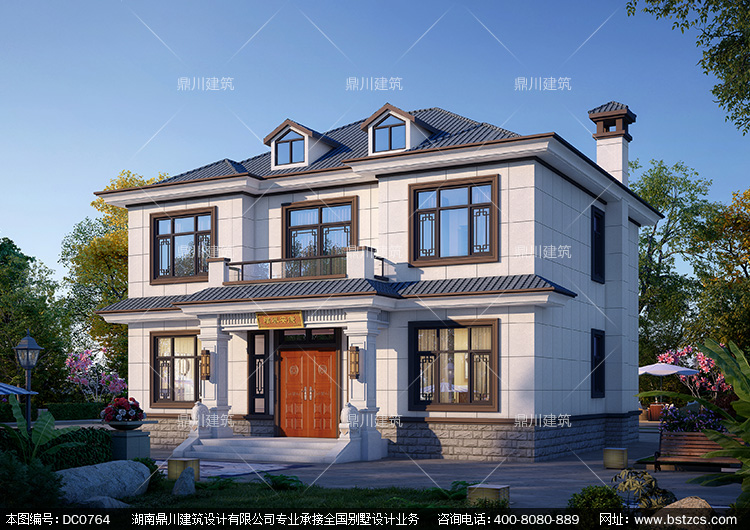 新中式二層帶露臺小別墅圖紙效果圖_農村兩層自建房設計,鼎川建