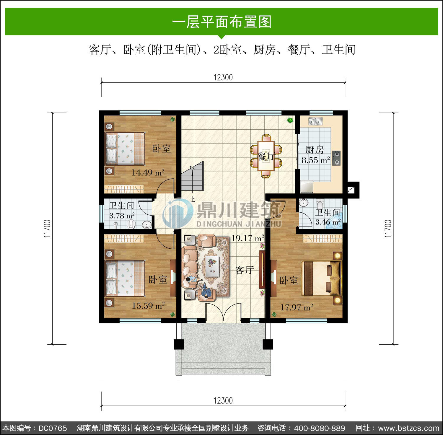 | 一 層: | 客廳、臥室(附衛生間)、2臥室、廚房、餐廳、衛生間 | |||