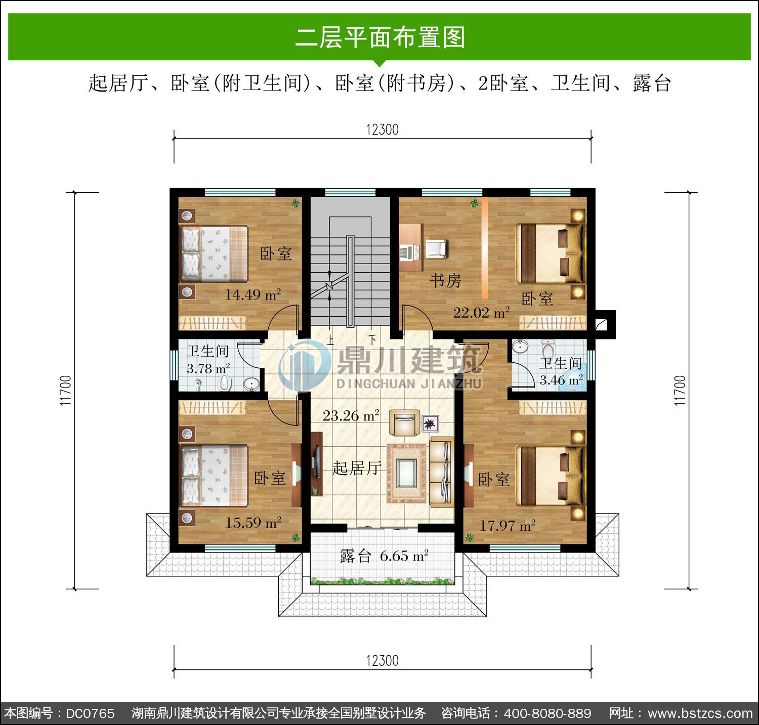 | 二 層: | 起居廳、臥室(附衛生間)、臥室(附書房)、2臥室、衛生間、露臺 | |||