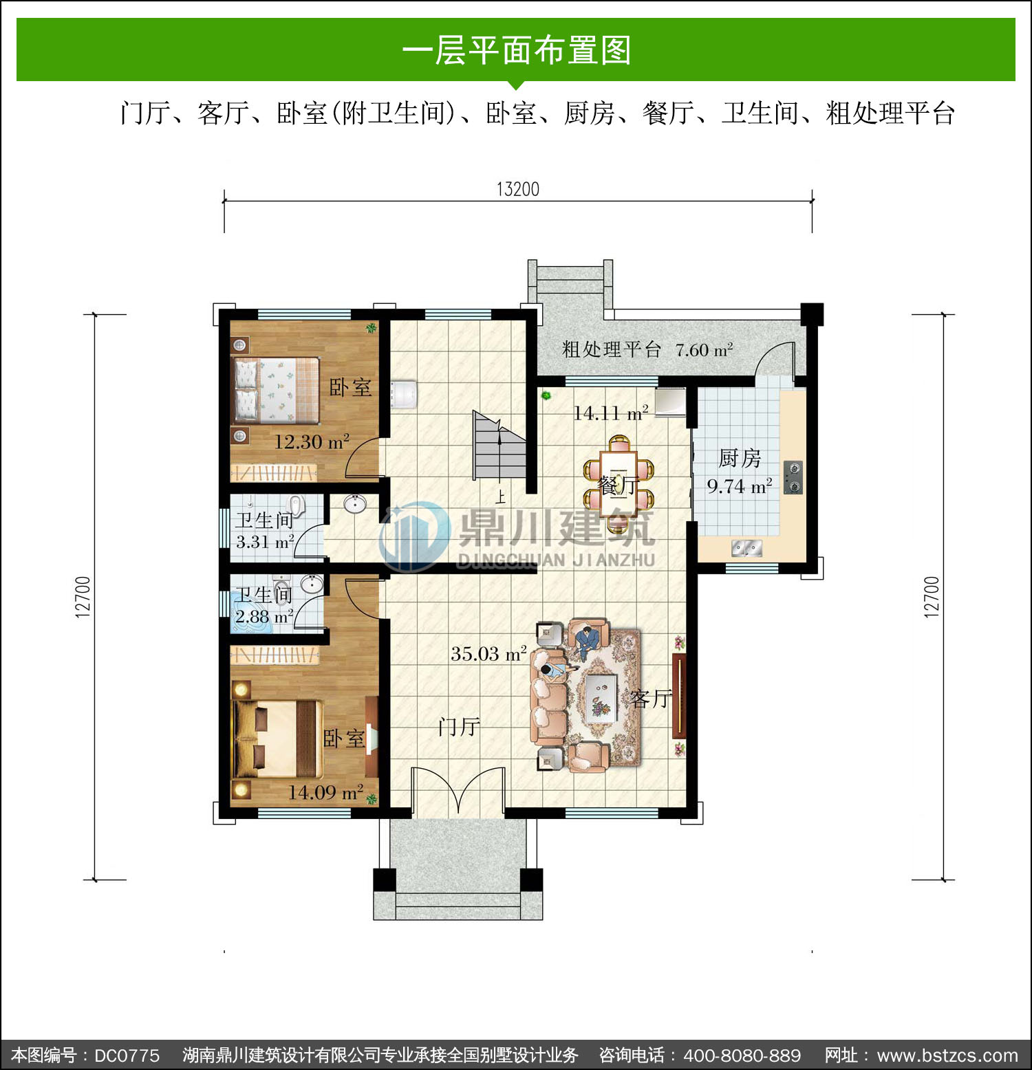 | 一 層: | 門廳、客廳、臥室(附衛生間)、臥室、廚房、餐廳、衛生間、粗處理平臺 | |||