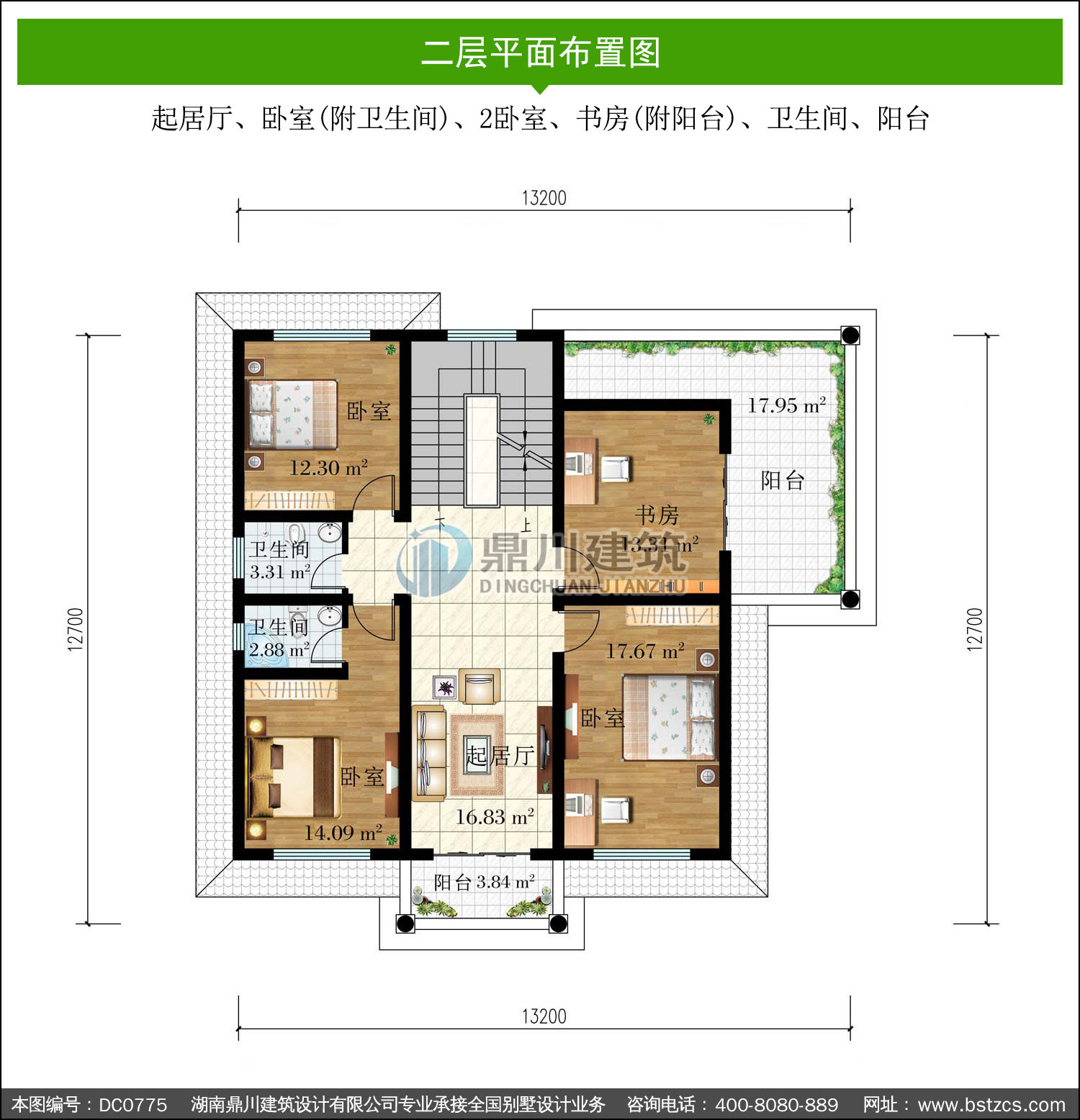 | 二 層: | 起居廳、臥室(附衛生間)、2臥室、書房(附陽臺)、衛生間、陽臺 | |||