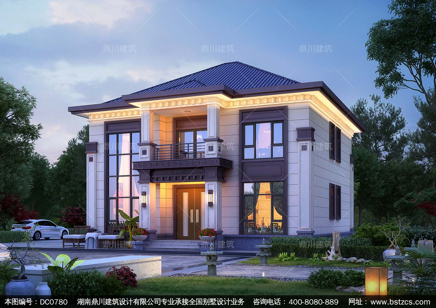新中式二層帶露臺小別墅圖紙效果圖_農村兩層自建房設計,鼎川建