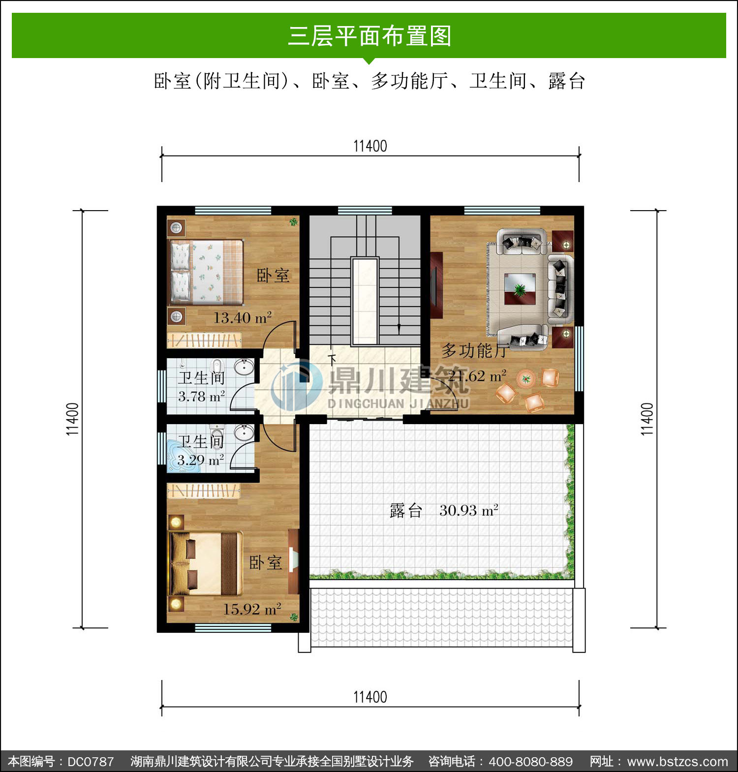 | 三 層: | 臥室(附衛生間)、臥室、多功能廳、衛生間、露臺 | |||