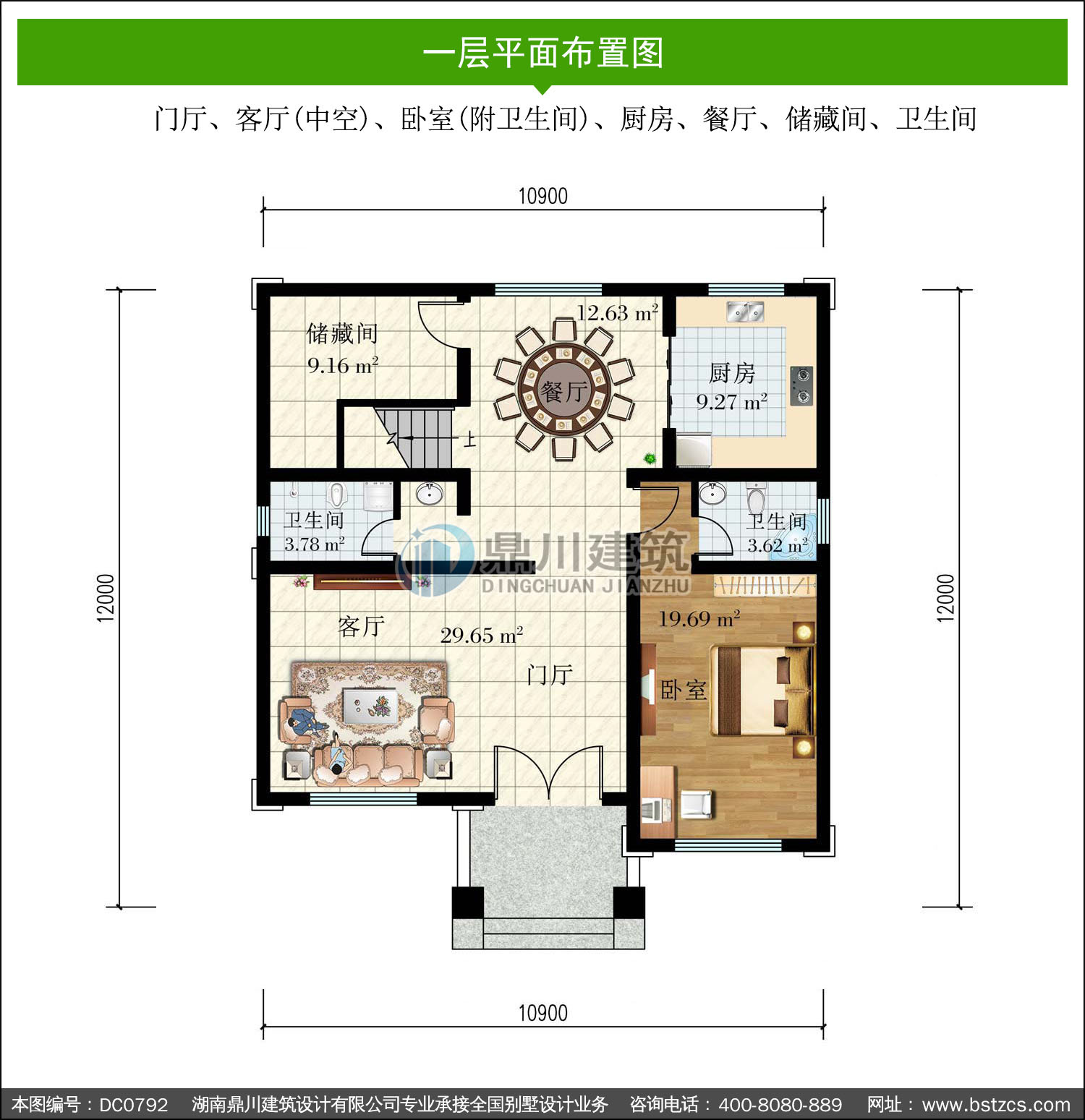 | 一 層: | 門廳、客廳(中空)、臥室(附衛生間)、廚房、餐廳、儲藏間、衛生間 | |||