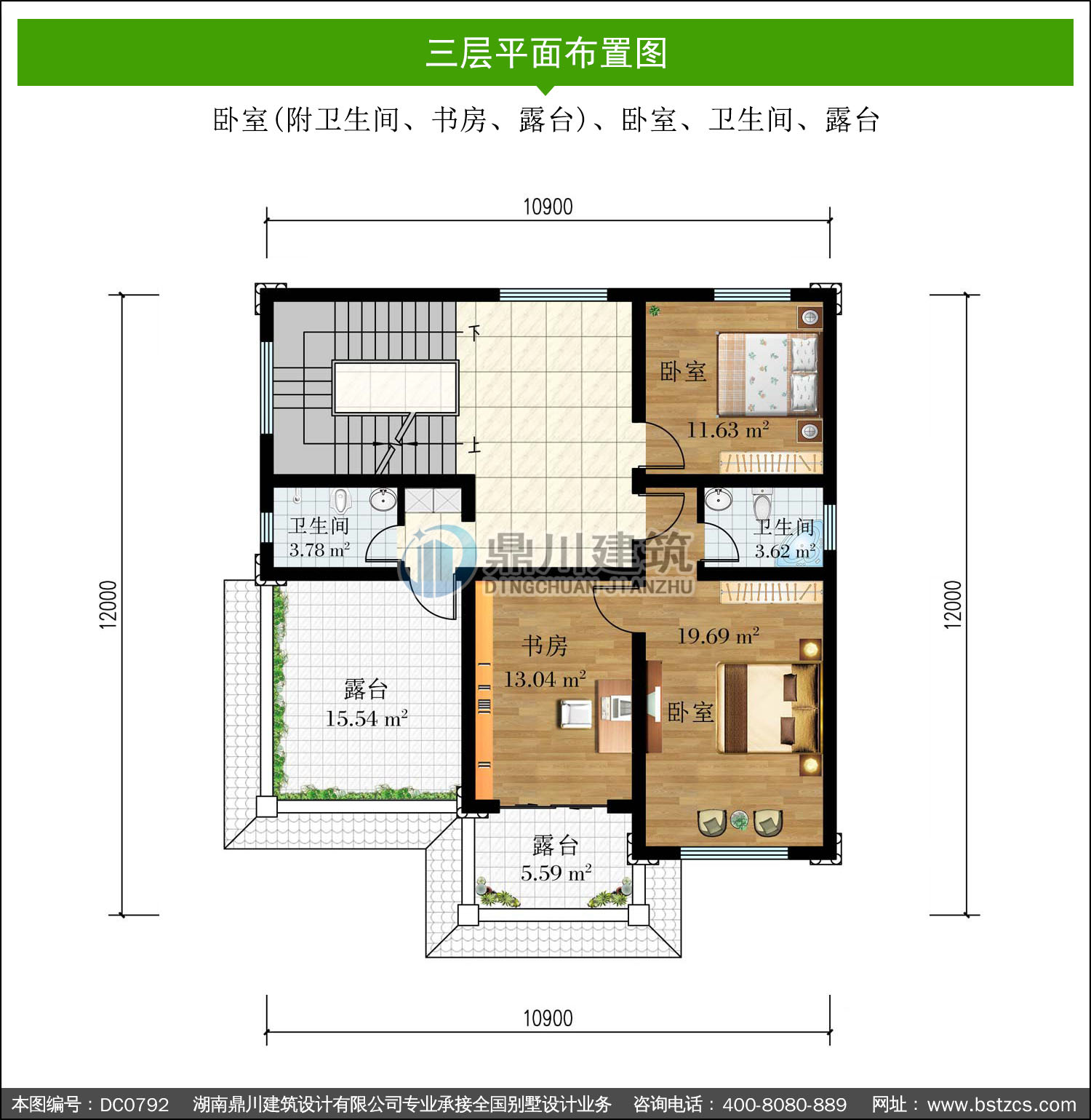| 三 層: | 臥室(附衛生間、書房、露臺)、臥室、衛生間、露臺 | |||