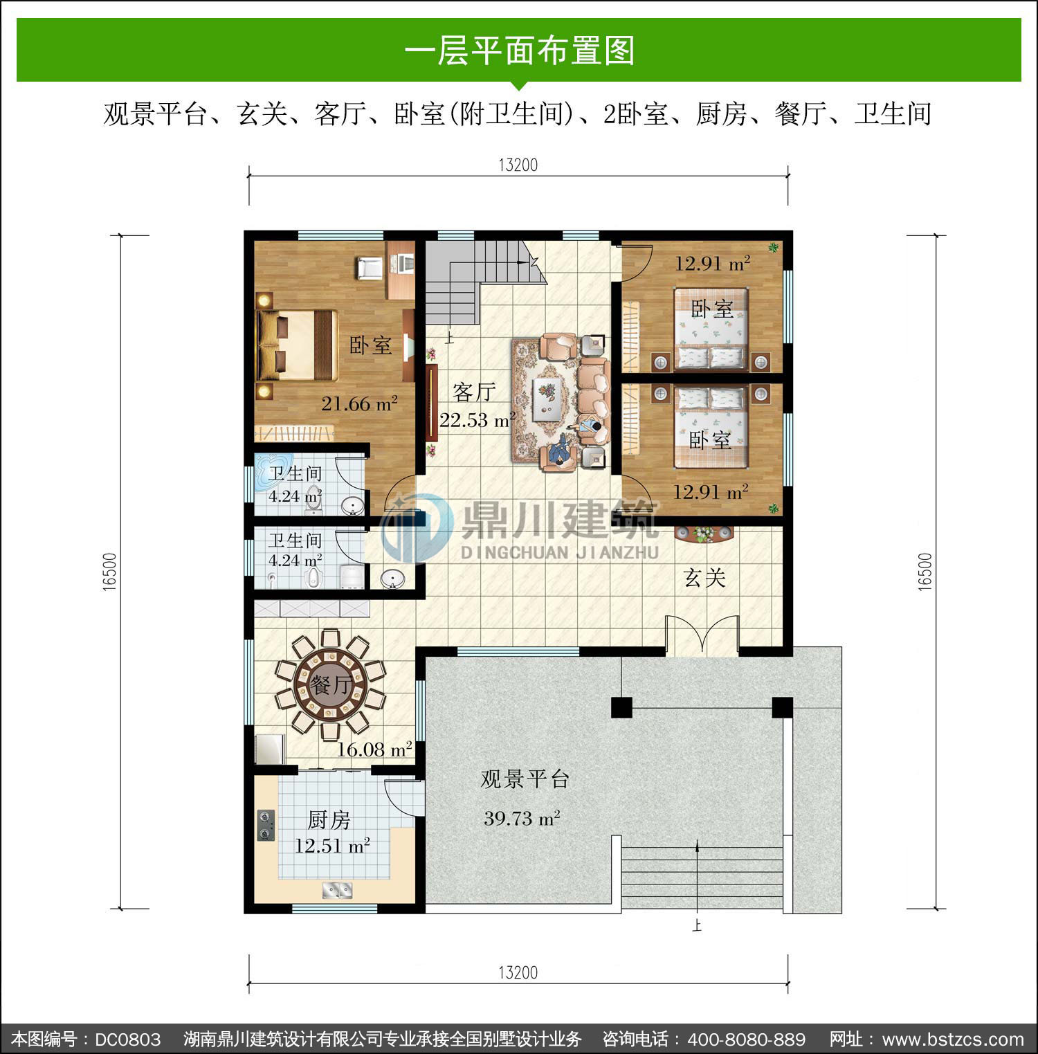 | 一 層: | 觀景平臺、玄關、客廳、臥室(附衛生間)、2臥室、廚房、餐廳、衛生間 | |||