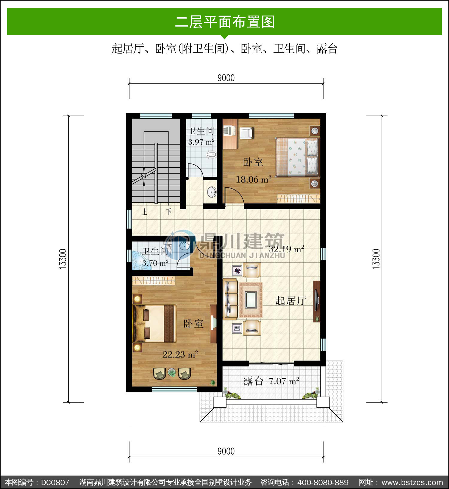 | 二 層: | 起居廳、臥室(附衛生間)、臥室、衛生間、露臺 | |||
