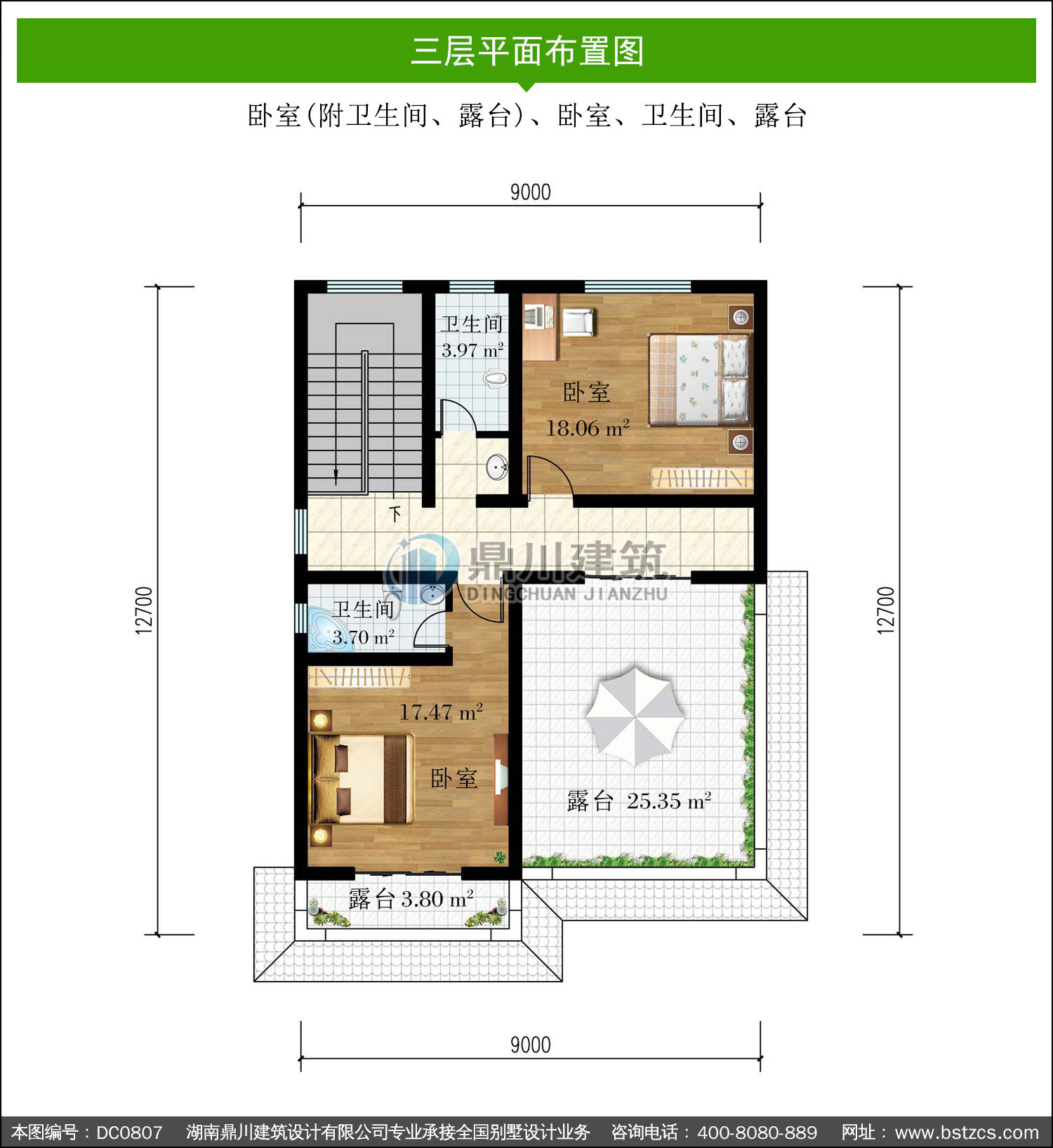 | 三 層: | 臥室(附衛生間、露臺)、臥室、衛生間、露臺 | |||