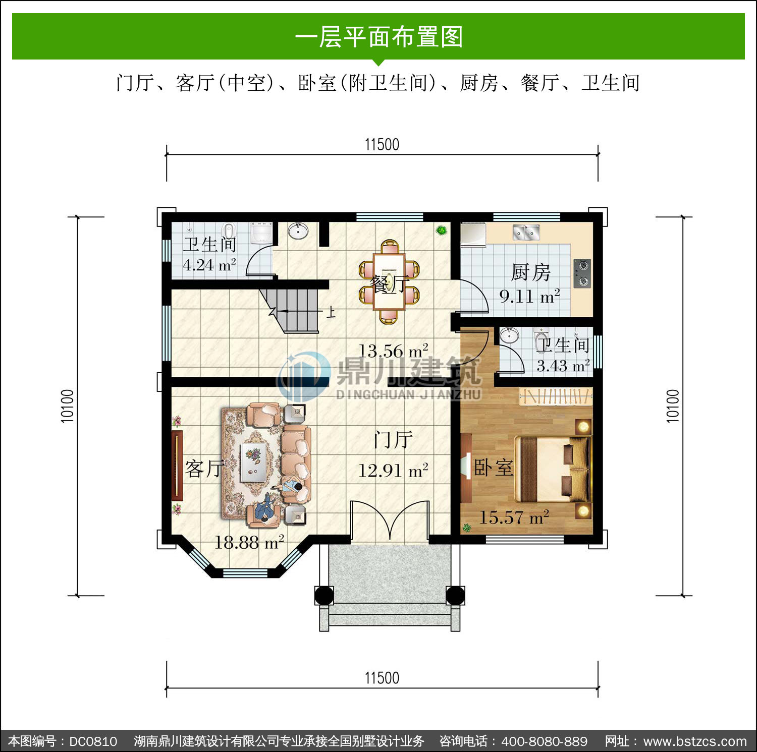 | 一 層: | 門廳、客廳(中空)、臥室(附衛生間)、廚房、餐廳、衛生間 | |||