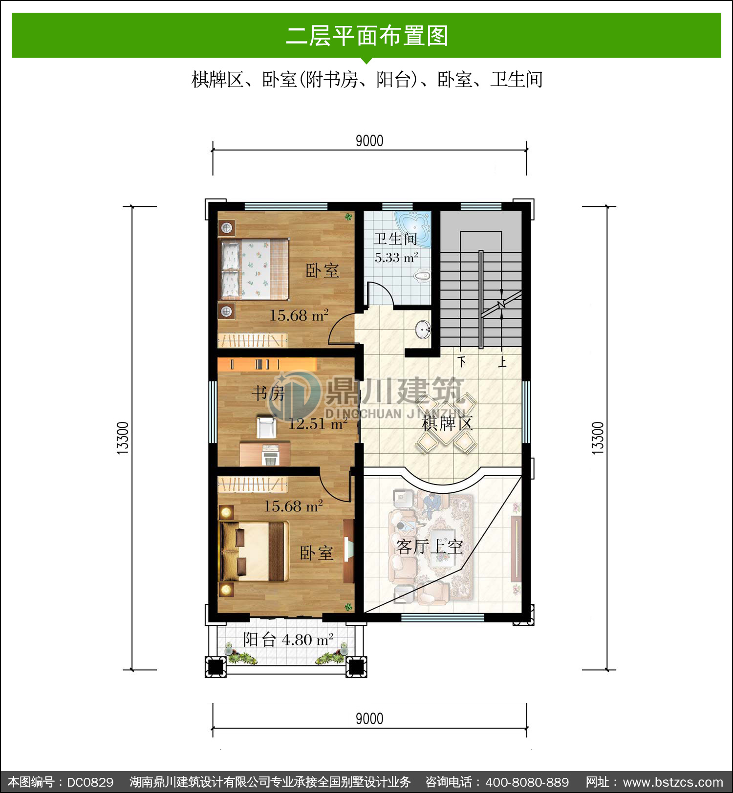 | 二 層: | 棋牌區(qū)、臥室(附書房、陽臺)、臥室、衛(wèi)生間 | |||