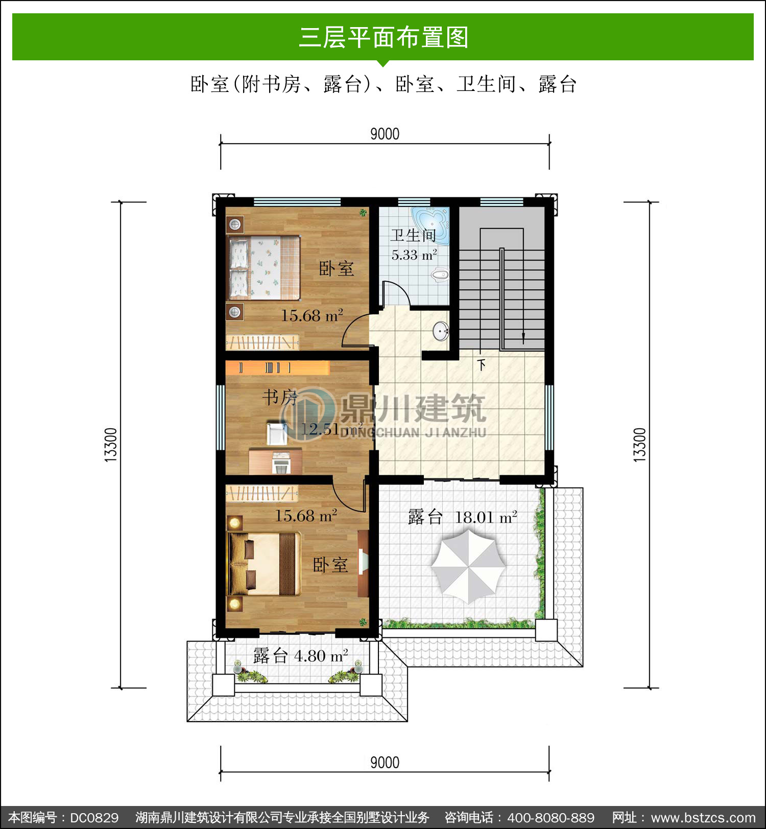 | 三 層: | 臥室(附書房、露臺)、臥室、衛(wèi)生間、露臺 | |||