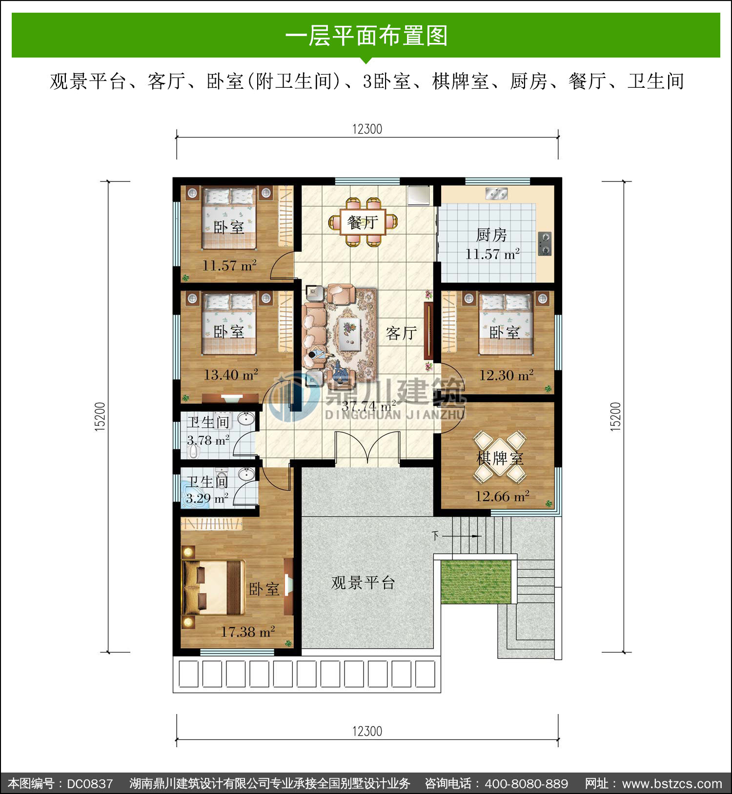 | 一 層: | 觀景平臺(tái)、客廳、臥室(附衛(wèi)生間)、3臥室、棋牌室、廚房、餐廳、衛(wèi)生間 | |||