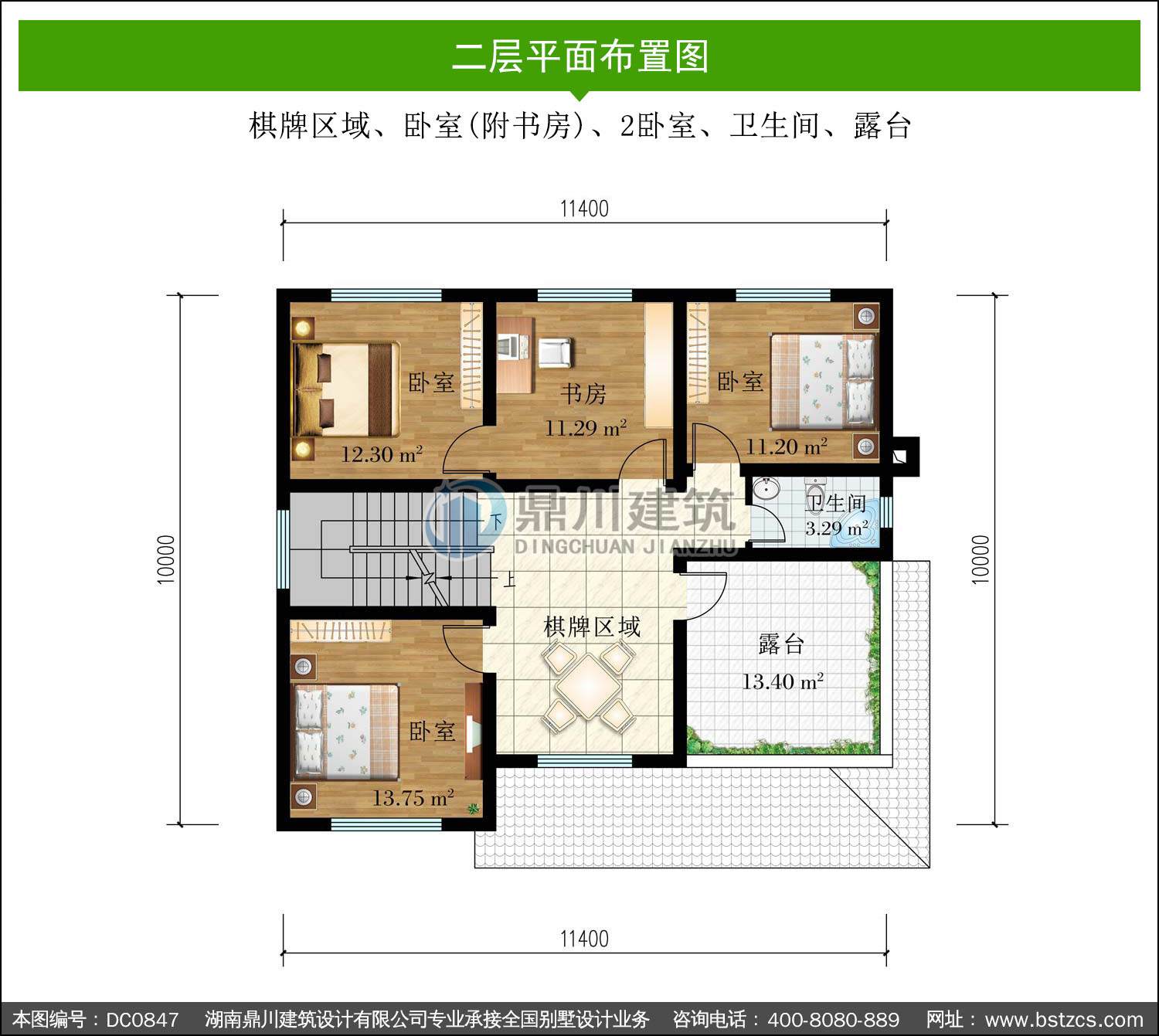 | 二 層: | 棋牌區(qū)域、臥室(附書房)、2臥室、衛(wèi)生間、露臺 | |||