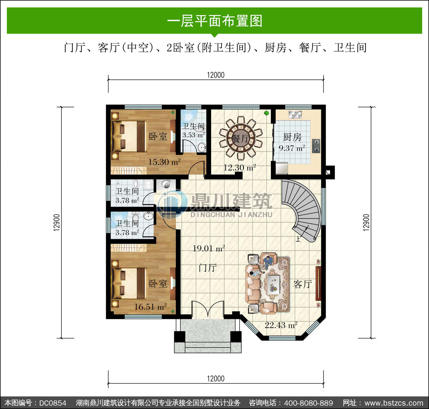 復式三層帶旋轉樓梯別墅施工圖紙及效果圖_農村自建房設計,鼎川建筑