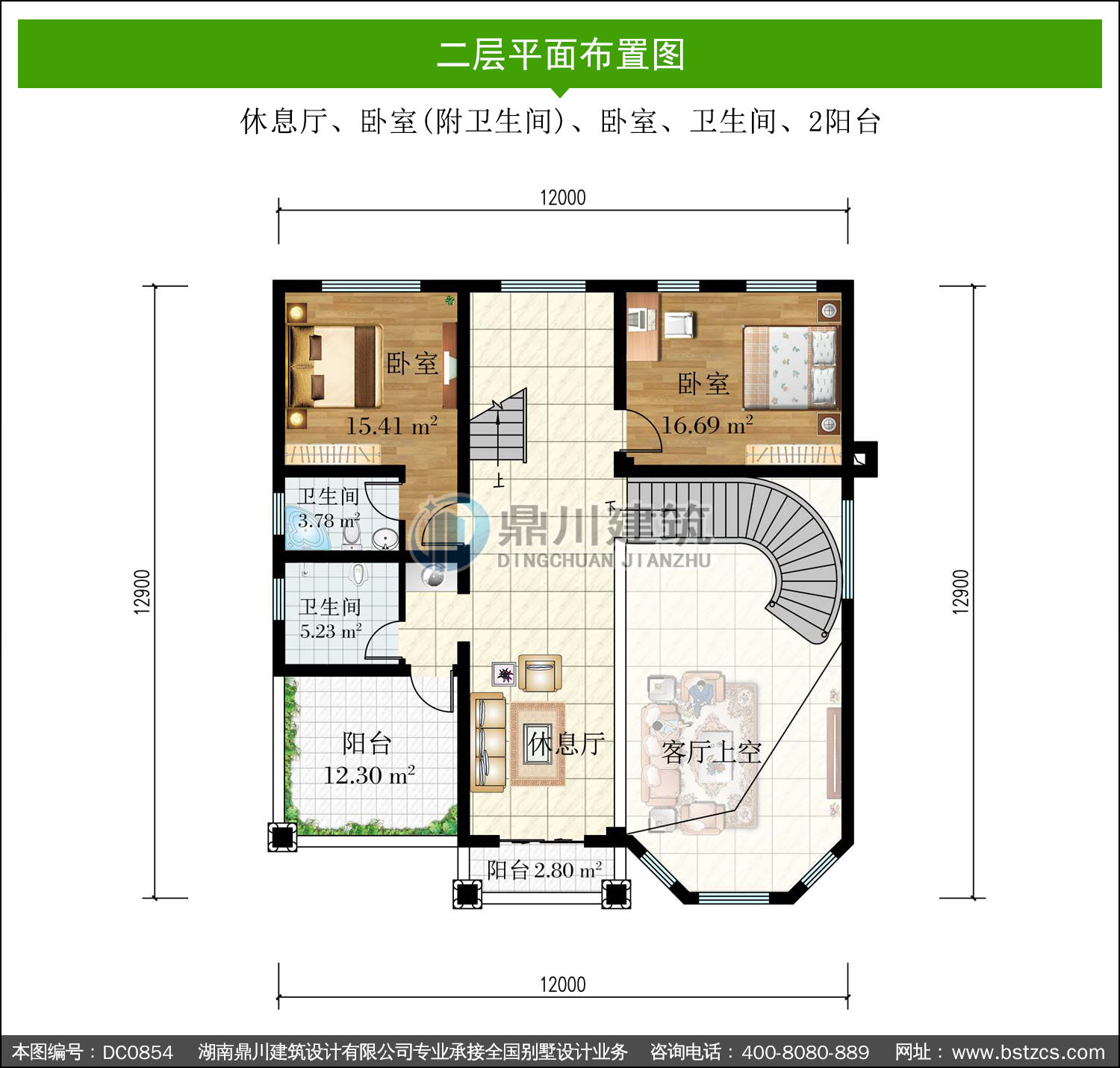 | 二 層: | 休息廳、臥室(附衛生間)、臥室、衛生間、2陽臺 | |||