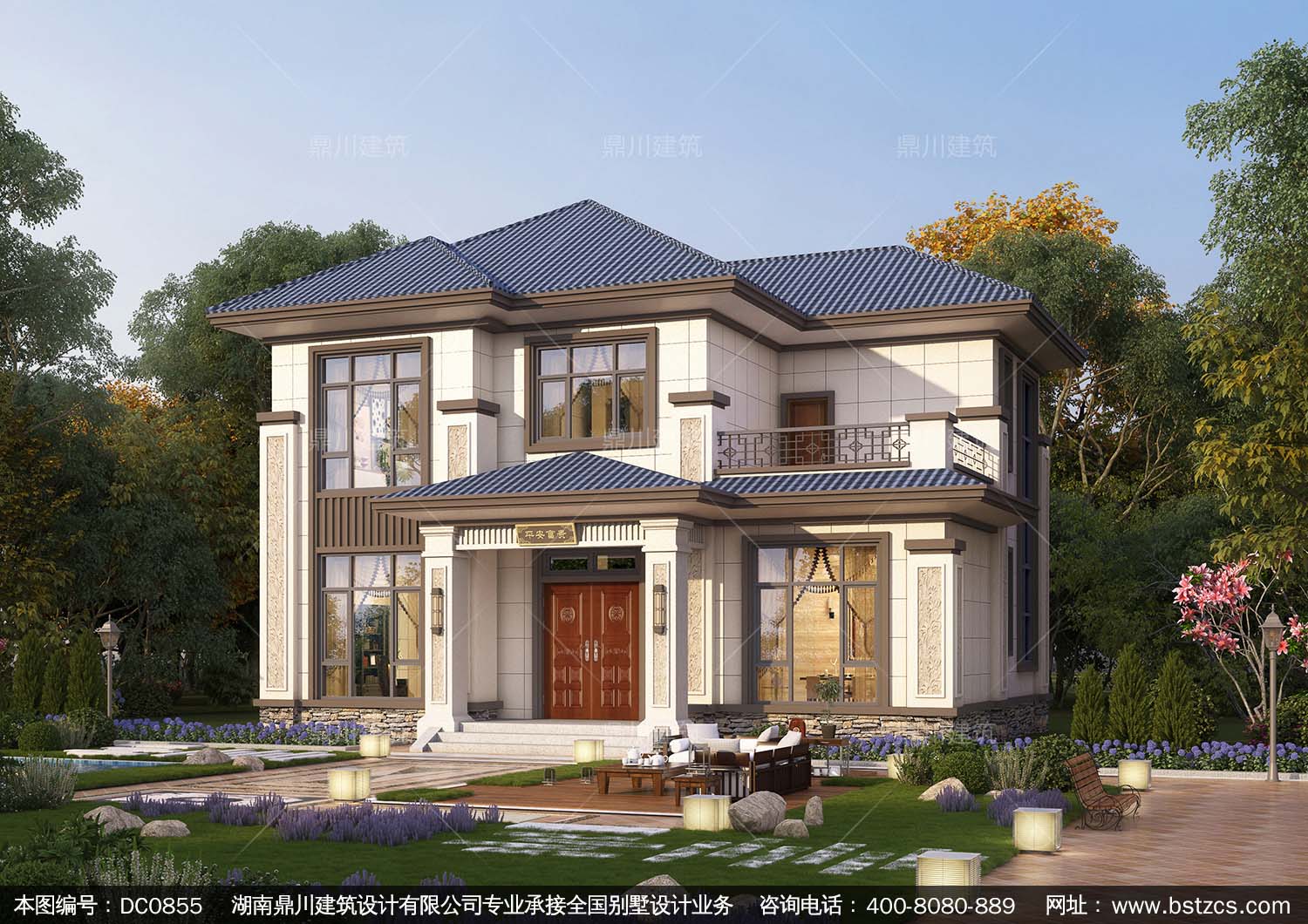 新中式二層帶露臺小別墅圖紙效果圖_農村兩層自建房設計,鼎川建