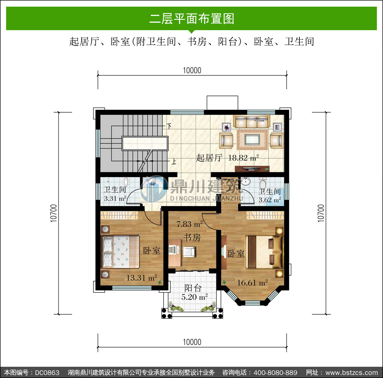 | 二 層: | 起居廳、臥室(附衛(wèi)生間、書房、陽(yáng)臺(tái))、臥室、衛(wèi)生間 | |||